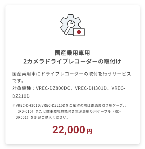 どれくらい工賃がかかるのか?状況によって追加が発生したりしないのか?不安に感じるユーザーもいるだろうが、パイオニア出張取付けサービスは料金が固定でオープンにされているのが安心だ。よほどのイレギュラーが無い限りは追加料金が発生することはないという。2カメラドライブレコーダーをパイオニア公式オンラインショップで購入した際に利用できる出張取り付けサービス例だが、駐車監視機能付き電源裏取り用ケーブルで装着してもこの価格。シガーソケットで装着するよりも作業内容的にはバリューだと感じる。