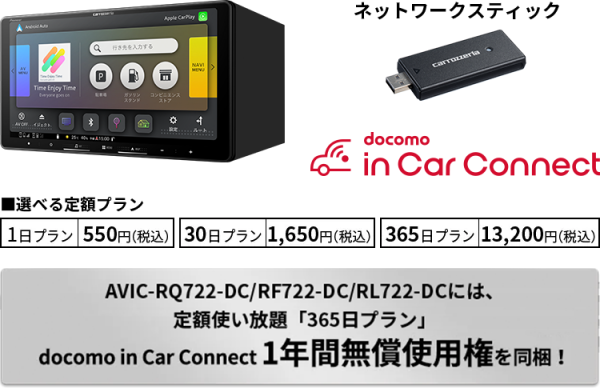 *車室内をWi-Fiスポットにする場合は、同梱のネットワークスティック、または別売のネットワークスティック「ND-DC5」が必要となります。また「ネットワークスティック」をご利用の場合は、「docomo in Car Connect」への登録とプランのチャージが必要となります。申し込みにはdアカウントが必要です。オンラインゲームなどお楽しみいただくコンテンツによっては通信の仕様上再生できない場合もあります。