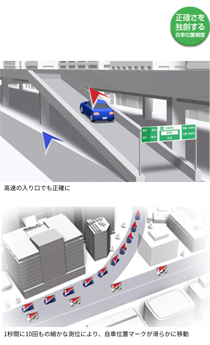 長年蓄積したノウハウと技術を駆使した独自の「IQ高精度」により、地下駐車場や高速道路の分岐など、カーナビが苦手とする場所でも正確に自車位置を把握し続け、ドライバーを迷わせません。