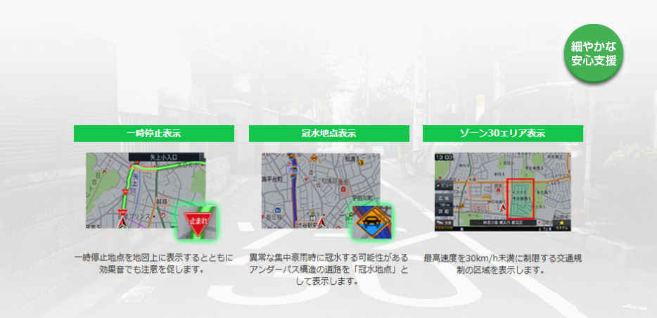 走行中に意識しなくてはいけない一時停止や速度制限エリア、天候によって通行できるか不安な冠水地点を、わかりやすい表示や効果音でお知らせ。 カーナビならではの心配りで、ドライブ中の「気になる」を事前に防ぎます。