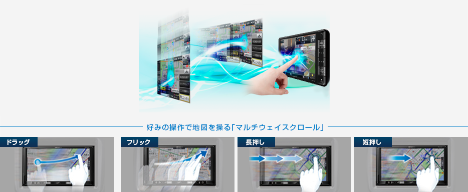 地図のスクロールも、スマートフォンのような感覚で意のまま地図を操れる「マルチウェイスクロール」により、あなたに合った探し方で目的の場所まですばやくたどり着けます。