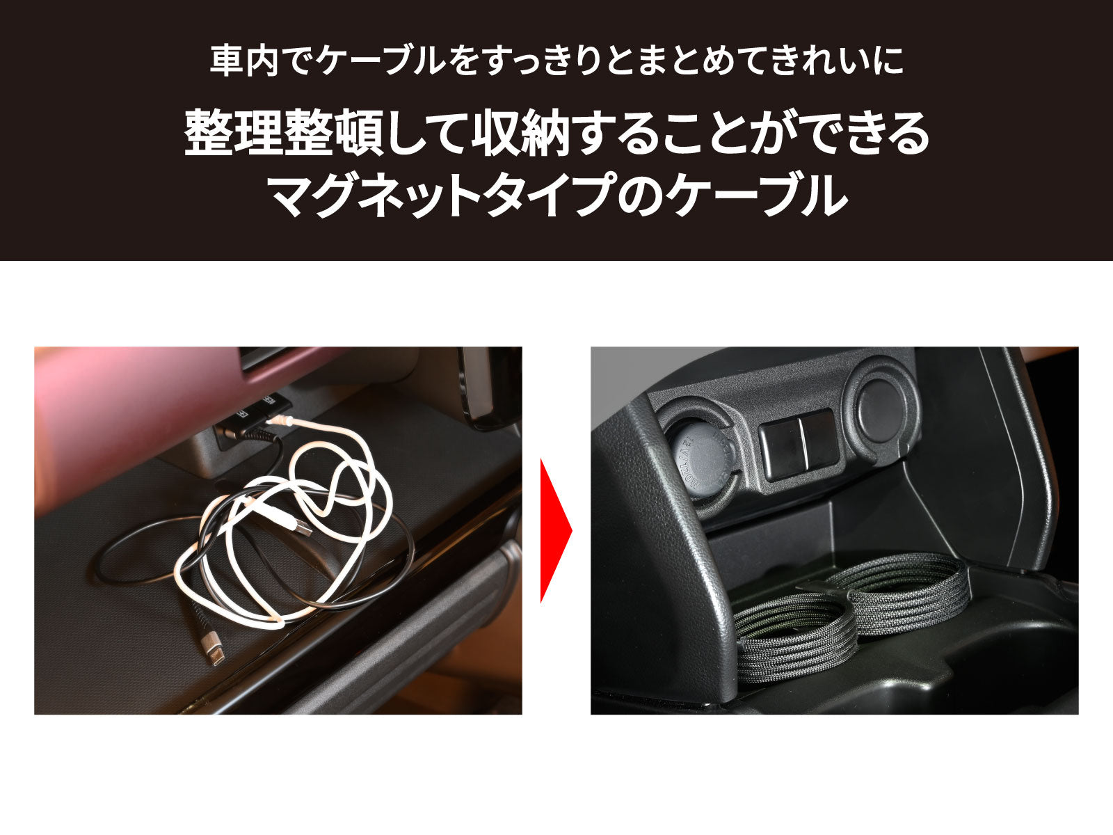 - 車室内をすっきりときれいに整頓・収納ができるマグネットタイプのライトニングケーブル