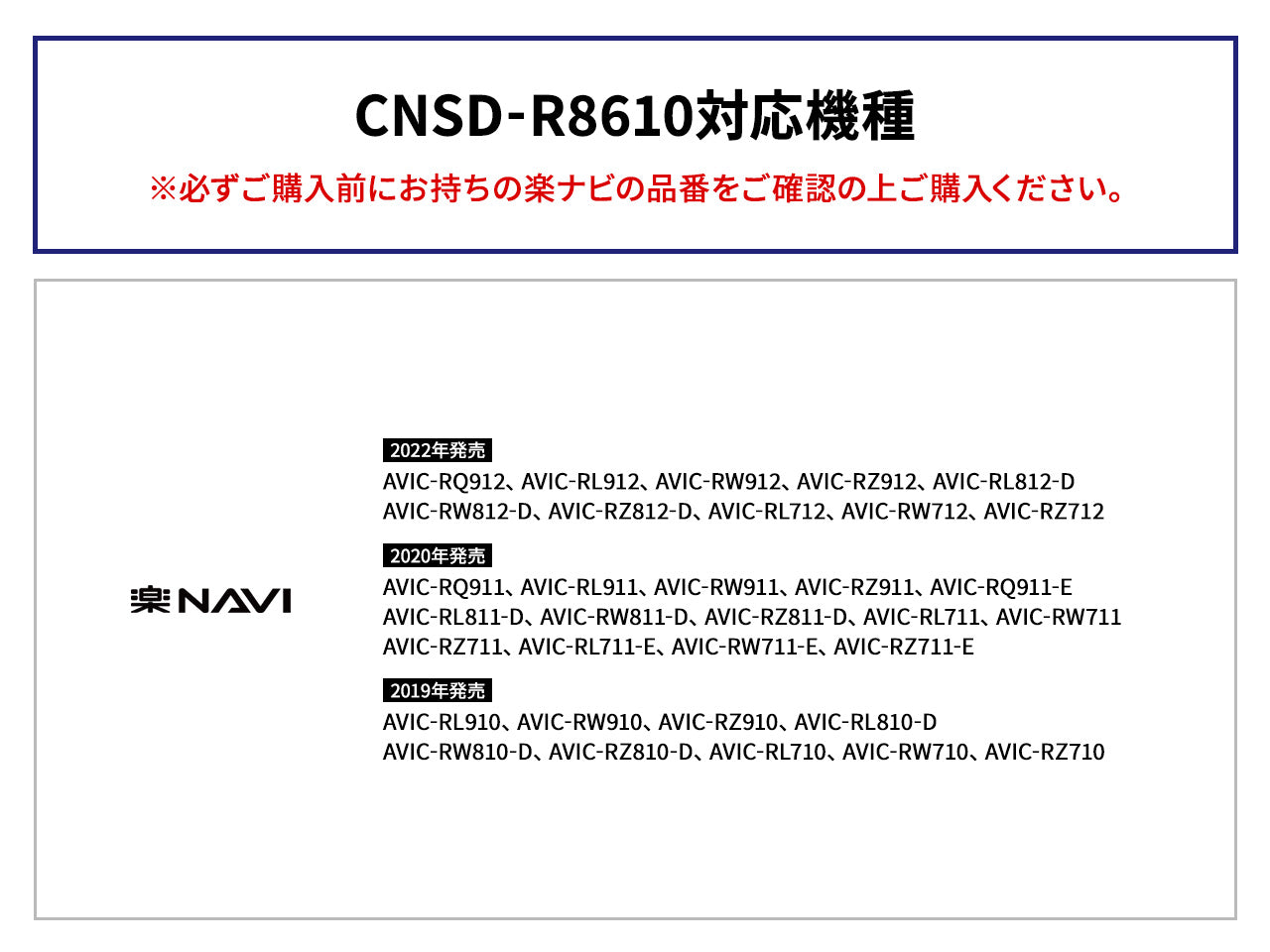 AVIC-RQ912、AVIC-RL912、AVIC-RW912、AVIC-RZ912、AVIC-RL812-D、AVIC-RW812-D、AVIC-RZ812-D、AVIC-RL712、AVIC-RW712、AVIC-RZ712、AVIC-RQ911、AVIC-RL911、AVIC-RW911、AVIC-RZ911、AVIC-RQ911-E、AVIC-RL811-D、AVIC-RW811-D、AVIC-RZ811-D、AVIC-RL711、AVIC-RW711、AVIC-RZ711、AVIC-RL711-E、AVIC-RW711-E、AVIC-RZ711-E、AVIC-RL910、AVIC-RW910、AVIC-RZ910、AVIC-RL810-D、AVIC-RW810-D、AVIC-RZ810-D、AVIC-RL710、AVIC-RW710、AVIC-RZ710