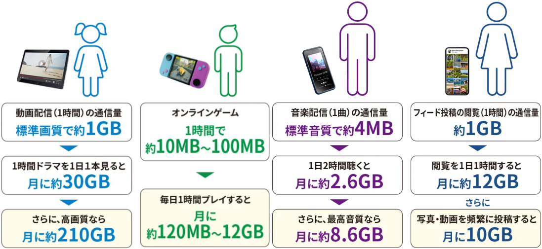 受信最大 150 Mbps(ベストエフォート方式) 送信最大 50 Mbps(ベストエフォート方式) ※通信速度は、送受信時の技術規格上の最大値であり、実際の通信速度を示すものではありません。ベストエフォート方式による提供となり、実際の通信速度は通信環境やネットワークの混雑状況に応じて変化します。 |