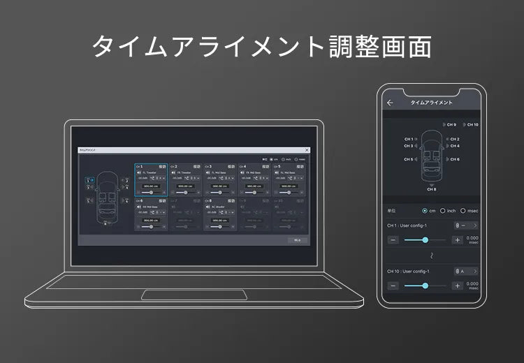 車室内は、リスニングポジションと各スピーカーからの距離が一定でないため、各スピーカーから同時に出た音声は、ドライバーの耳に異なったタイミングで到達します。このわずかな時間差を調整するために、各スピーカーとリスニングポジションまでの距離を手動で設定。音声の到達時間を補正することで、音像の定位や全体的なバランスを調整し、あらゆるクルマをより理想的な音響空間へと導きます。 〔 0cm~680cm/20msec、0.35cm/0.01msecステップ〕