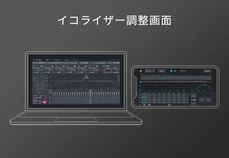 車室内の周波数特性の乱れを理想的な状態に補正するため、自在なまでの調整を可能にするイコライザーを搭載。あらゆるクルマでフラットな音響特性に近づけることができます。