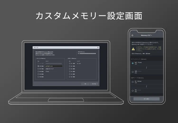 イコライザー、タイムアライメント、スピーカー出力レベルの設定値を6パターンまで登録可能。楽曲や乗車人数などに合わせて切換えができます。またワンタッチで切換えができるので、微調整時の聴き比べにも役立ちます。