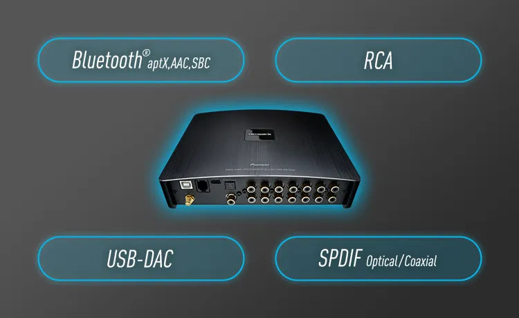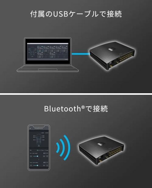 RCAもしくはスピーカー入力した純正システムなどのソース音源だけではなく、ハイレゾにも対応したBluetooth®接続を介したスマートフォンの音源も直接再生が可能。その他にもデジタルオーディオプレーヤーの接続に対応したUSB-DAC※入力を装備するなど様々なメディアの再生を可能にする入力を装備しています。