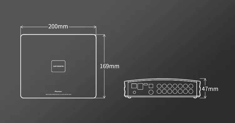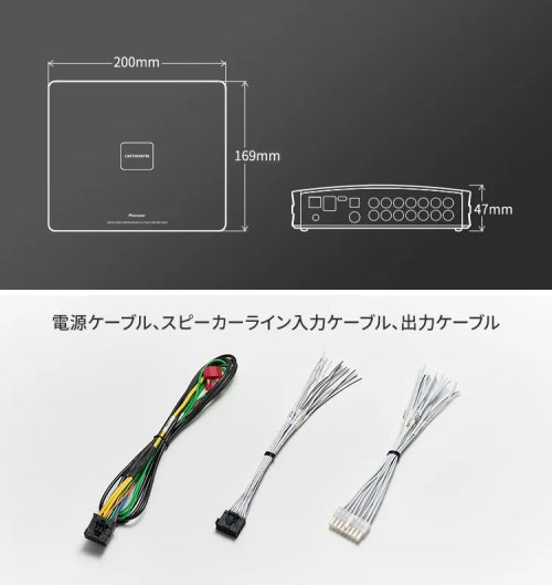 幅200mm×高さ47mm×奥行き169mmの小型設計で、シート下などの狭いスペースにも無理なく設置できます。また、電源ケーブル、スピーカーライン入力ケーブル、出力ケーブルを同梱。同梱品だけでの取付けが可能です。