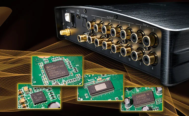 アンプやスピーカーシステムなど本格的なオーディオシステム構築にも対応可能な10系統の4.0Vハイボルテージプリアウトを装備。一般的なフロント/リアの4スピーカーシステムやマルチアンプ・マルチスピーカーシステムなど幅広いシステム展開が可能です。