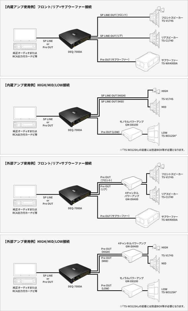純正システムなどとの接続を可能にするスピーカーラインの入出力や外部機器との接続が可能なRCA出力を持つオーディオシステムと本格的なサウンドシステムを構築するRCA入出力までを装備。幅広いシステム展開も可能な入出力系統を備えました。