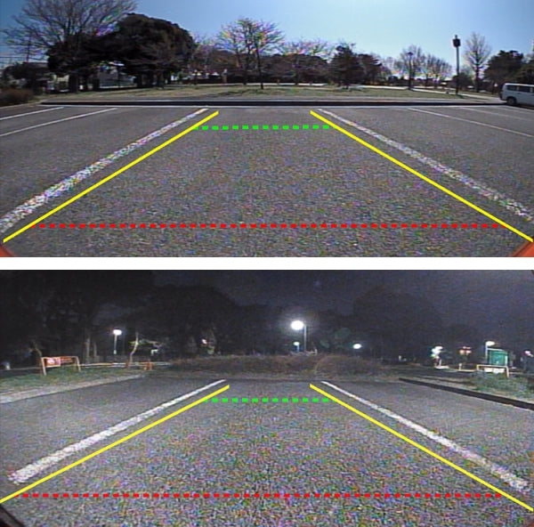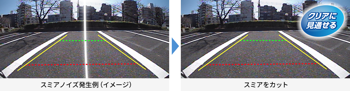 太陽や街灯などの極端に明るい環境下でも、スミアノイズ(白飛び)のないクリアな映像で後方確認ができます。