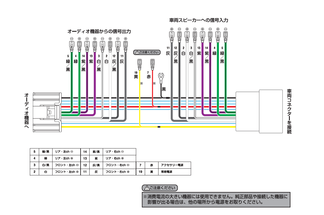 純正システムのスピーカーラインとの接続をスムーズにする入出力ケーブル。純正配線を切ることなくカプラーの接続だけで取付け可能。
