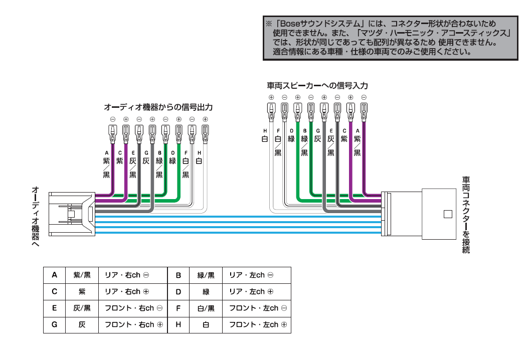 純正システムのスピーカーラインとの接続をスムーズにする入出力ケーブル。純正配線を切ることなくカプラーの接続だけで取付け可能。