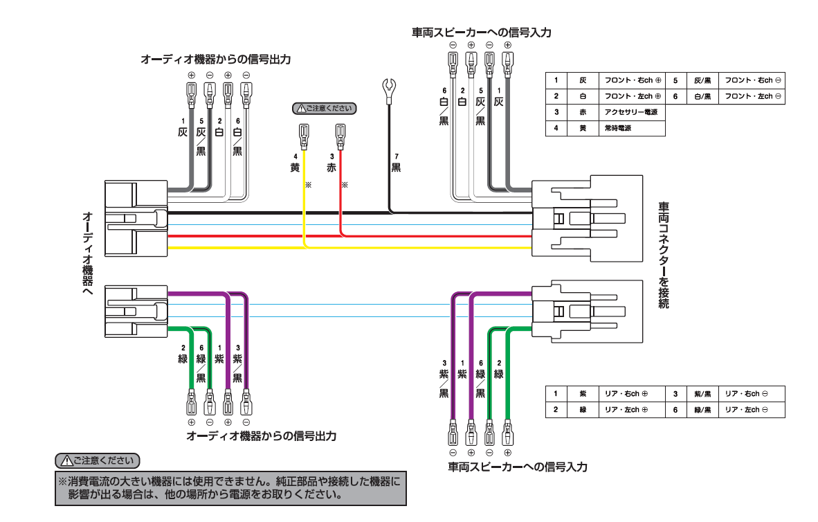 純正システムのスピーカーラインとの接続をスムーズにする入出力ケーブル。純正配線を切ることなくカプラーの接続だけで取付け可能。