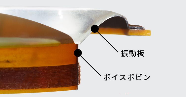 ボイスボビンと振動板との伝播ロスが少ない「頂点駆動方式」を採用。振動板の動きをより正確に制御し、不要共振を徹底的に排除しました。歪みの少ない細かい音までも忠実に再現します。