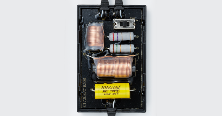 高品位の音響パーツを採用することで低クロスオーバーを実現するCシリーズ専用の「クロスオーバーネットワーク」。ウーファーとトゥイーターのチャンネルを分けることでバランスの良い音を届けます。