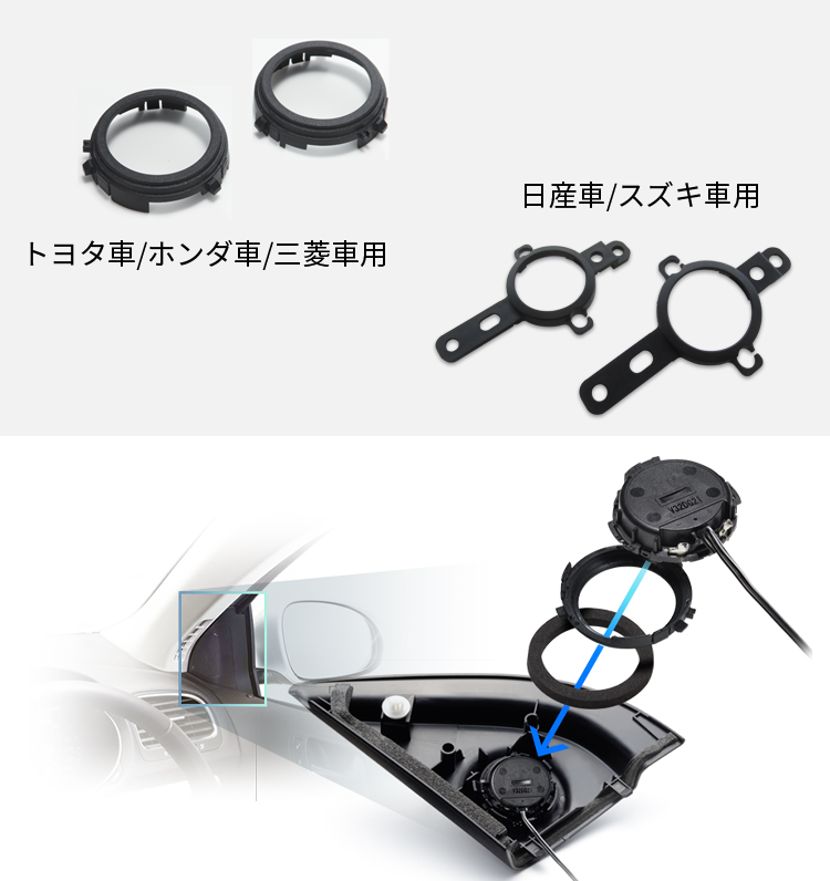 トヨタ 23車種、日産 8車種、ホンダ 26車種、三菱 12車種、スバル 6車種、スズキ 13車種の純正トゥイーター位置に取付け可能なブラケットを同梱します。