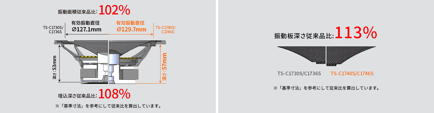 取付カバレッジを維持しながらもウーファーの振動板面積を最大化し、埋込み深さの深型化を追求。カロッツェリアのノウハウを集結し、カスタムフィットスピーカーは限界域へ。