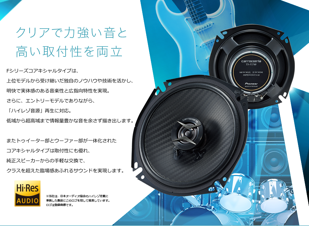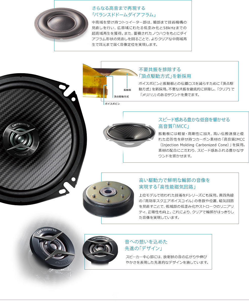 繊細かつ迫力ある音で車室内を満たすFシリーズコアキシャルスピーカー。新技術の採用や素材の見直しで、さらに「クリア」で「メリハリ」のある「力強い」音を実現。コアキシャルタイプでありながらも広指向特性と優れた前方定位により、豊かな音場を再現し、クラスを超えたサウンドを響かせます。