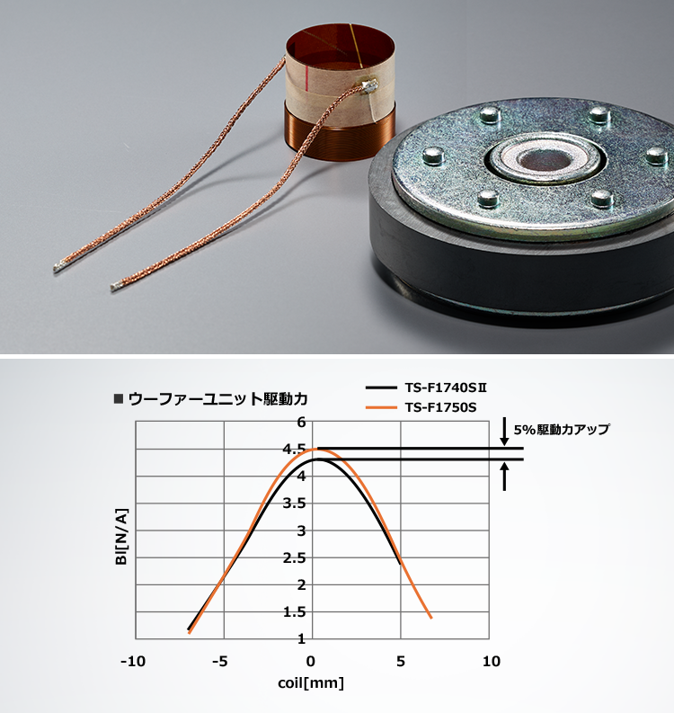 上位モデルで培われた駆動系の技術刷新をもとに、ボイスコイルの位置や磁気回路の見直しを図り、駆動力を従来比で5%向上。よりパワフルで力強い低域再生を実現します。