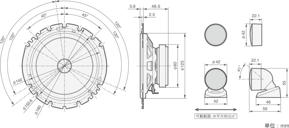 車室内の形状や取付位置、ドライバーの座高の高さに合わせて取付後でも上下41°、左右32.6°まで角度調整が可能。中高域の指向性を制御し、より最適な音場を構築できます。