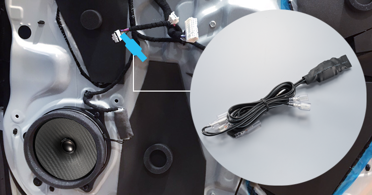 純正システムのスピーカーラインとの接続を、スムーズにする別売「スピーカーライン入出力ケーブル」。純正配線を切ることなくカプラーの接続だけで取付けできるので、手間なく接続することが可能になります。