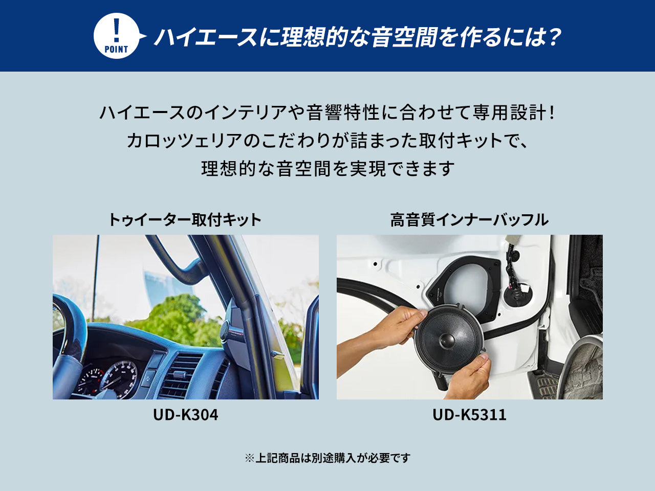 ウーファーユニット装着用に、トヨタ/日産/マツダ/スズキ車用とホンダ車用の2種類のウーファー取付ブラケットを用意。別売のブラケットを購入することなく、スムーズな取付けが可能です。