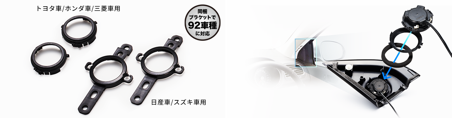 トヨタ車/日産車/ホンダ車/三菱車/スバル車/スズキ車の純正トゥイーター位置に取付けが可能なブラケットを同梱しています。