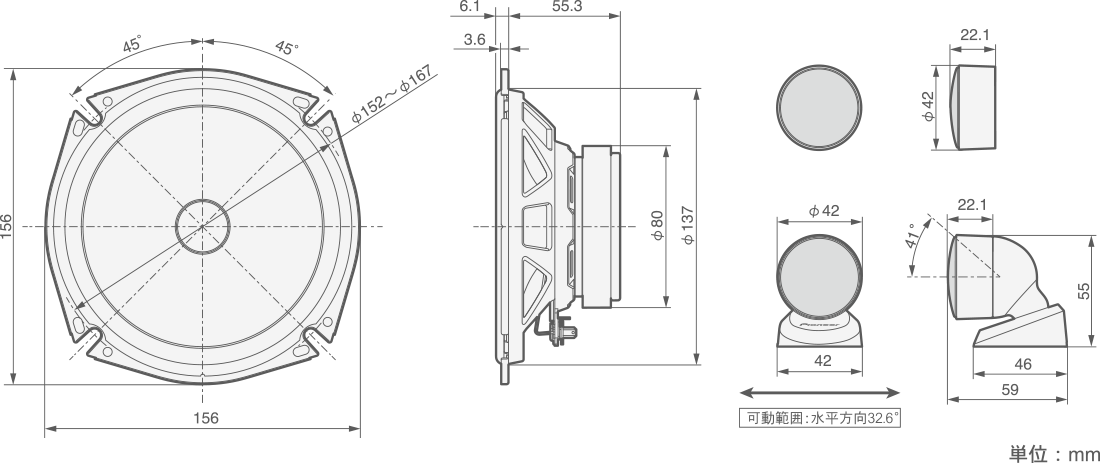 車室内の形状や取付位置、ドライバーの座高の高さに合わせて取付後でも上下41°、左右32.6°まで角度調整が可能。中高域の指向性を制御し、より最適な音場を構築できます。