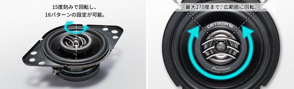 トゥイーターのフランジ部分を回転させることでフィンの向きを調整できる「ロータリー機構」を採用。車種ごとに異なるスピーカー取付位置に最適な指向性を確保し、臨場感あふれる中高域音場を実現します。