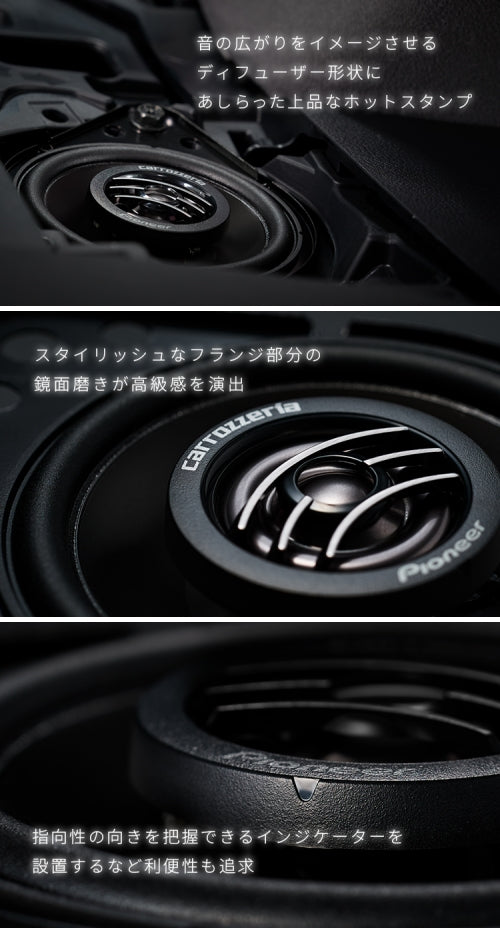 音の広がりをイメージさせるディフューザー形状にあしらったホットスタンプが、高品位感を演出。また、フランジ部分には鏡面磨き、その周辺にはシボ加工を施した上にシルバーのカロッツェリアロゴが象徴的に印刷され、上質かつ存在感あふれる佇まいを表現しています。さらに、見た目だけでなく、指向性の向きを把握できるインジケーターを設置し、利便性にも優れたデザインを実現しています。