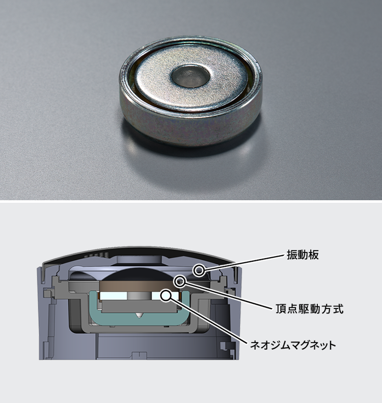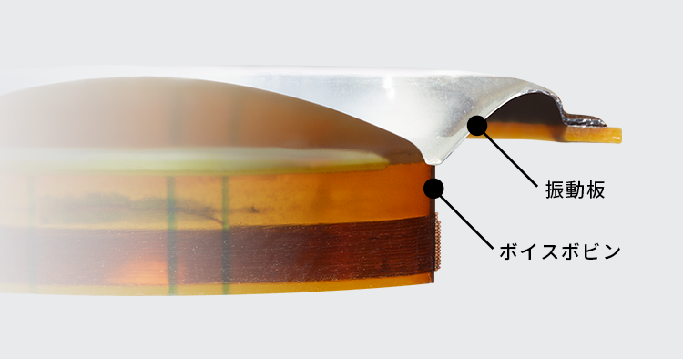 ボイスボビンと振動板との伝播ロスが少ない「頂点駆動方式」を採用。振動板の動きをより正確に制御し、不要共振を徹底的に排除しました。歪みの少ない細かい音までも忠実に再現します。