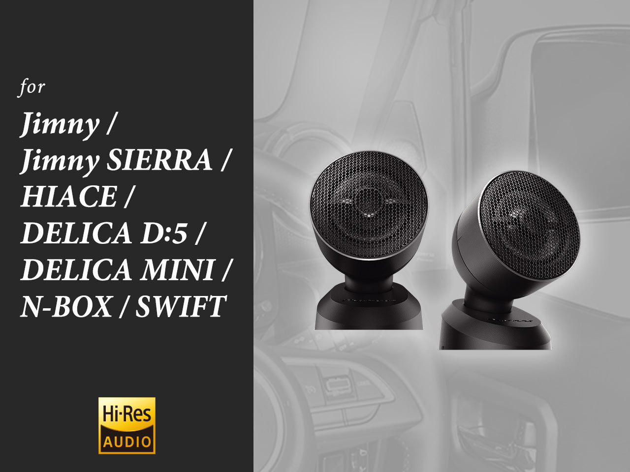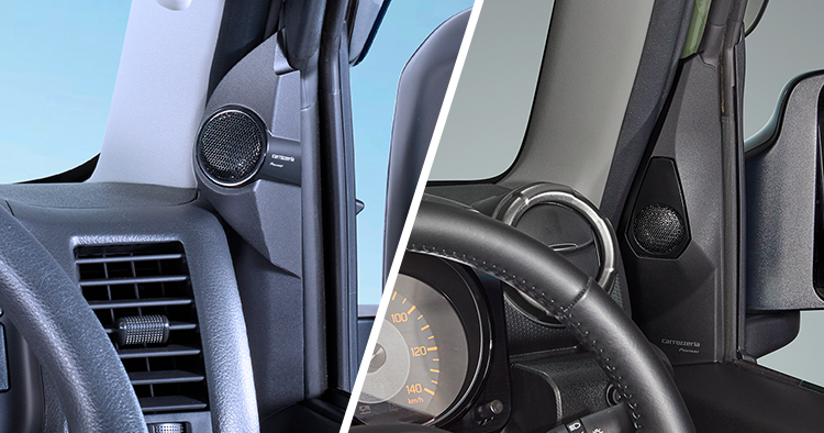 指向特性に優れ、低歪みでクリアな高域再生を実現するため、振動板などの構成パーツを新たに開発することで「ハイレゾ音源」に対応した、臨場感豊かな高域再生を実現しています。また、純正スピーカーにも簡単に接続ができ、「可動式台座」によってドライバーにとって最適な向きに角度調整が可能。どんなクルマにも最適なシステムアップが可能です。
