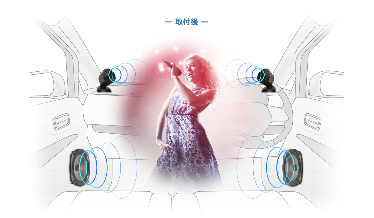 チューンアップトゥイーターとして、純正ドアスピーカーにアドオンするだけで高域不足をカバーした広帯域再生を実現。純正ドアスピーカーにありがちな足元近辺に偏った定位を前方定位に改善し、ボーカルが目の前に浮かび上がるような高い音場感を実現します。