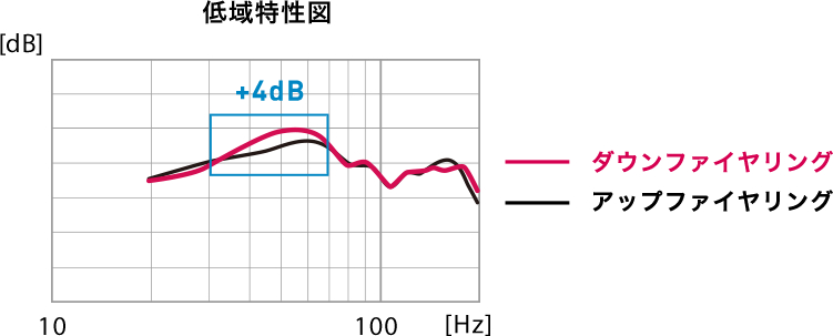 ダウンファイヤリング方式はアップファイヤリング方式と比較して最大約+4dBの音圧を実現。効率良くパワフルな低域再生を可能にしています。