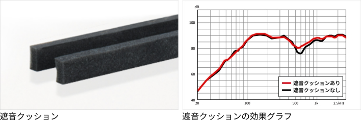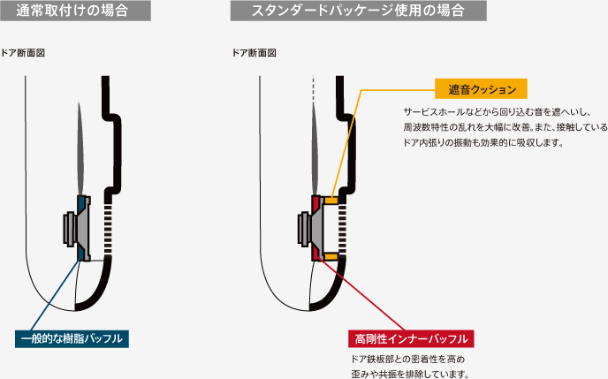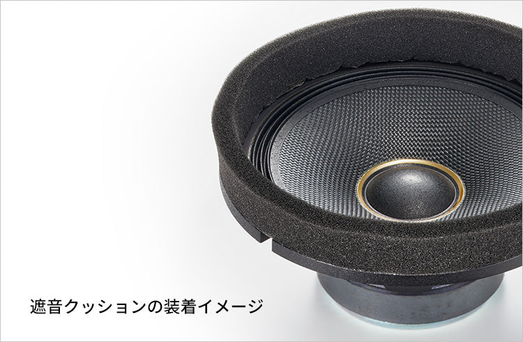 スピーカーとドア内張りの間を埋める遮音クッションを付属。遮音性に優れた低密度発泡層によるクッションを採用することでサービスホールなどを通して回り込んでくるスピーカー背面からの逆相音を遮蔽し、飛躍的にクリアにします。