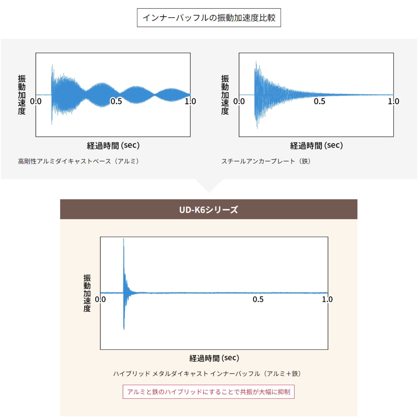 アルミと鉄のハイブリッドにすることで共振が大幅に抑制