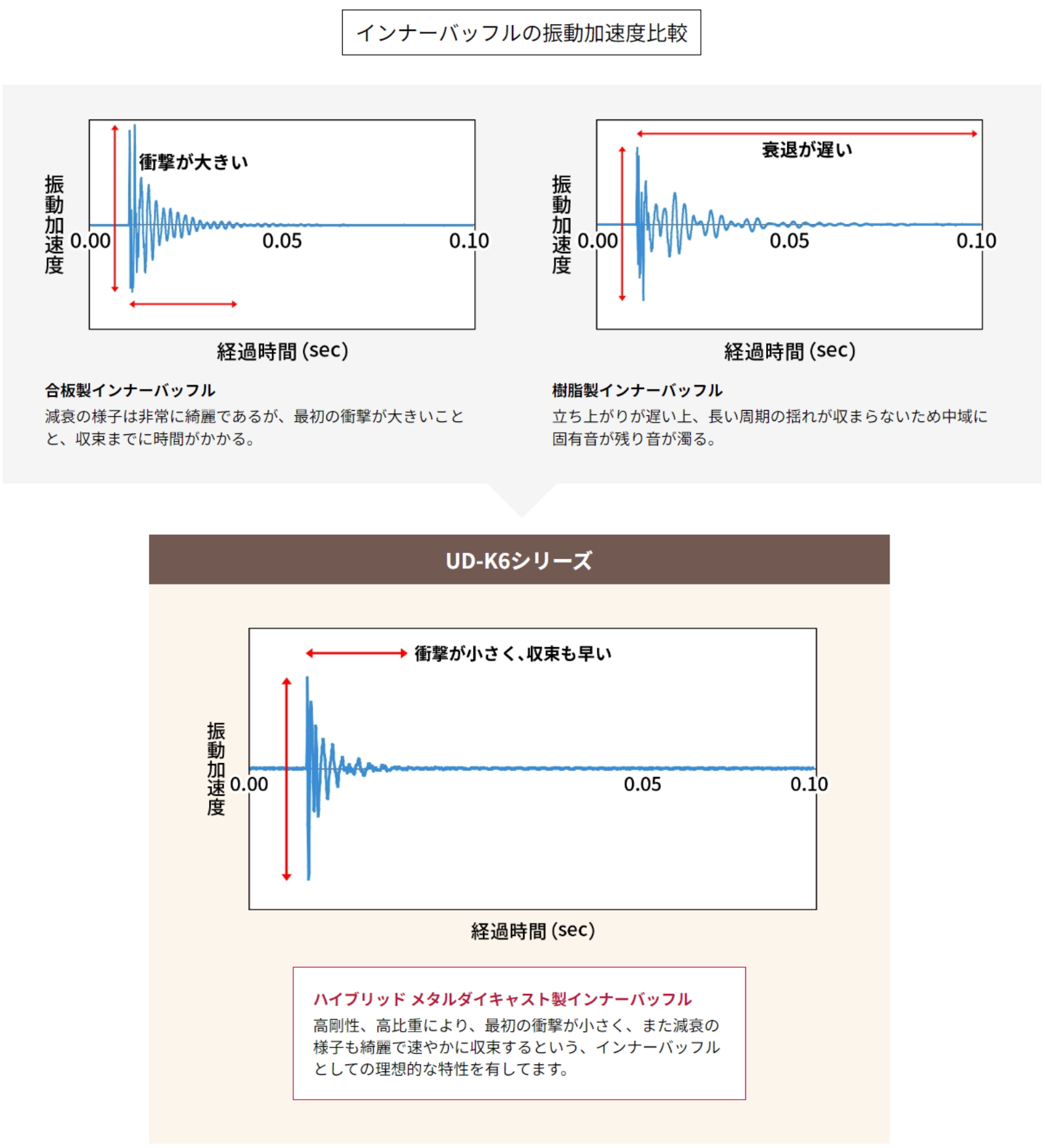 他の素材と比べて圧倒的に優れた振動の減衰特性を実現。 衝撃が小さく、収束も早い。