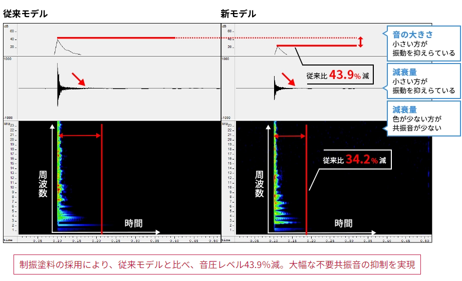 制振塗料の採用により、音圧レベルは43.9%減、共振時間は最大34.2%減を実現(従来比)。不要な共振音を大幅に抑えて、飛躍的に音質を向上させます。
