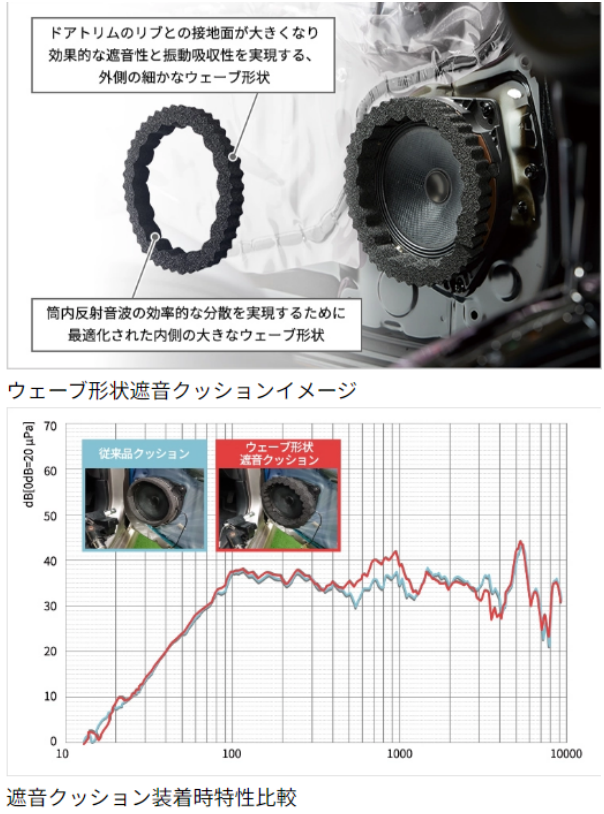 フラットな周波数特性を獲得する「ウェーブ形状遮音クッション」を採用しています。