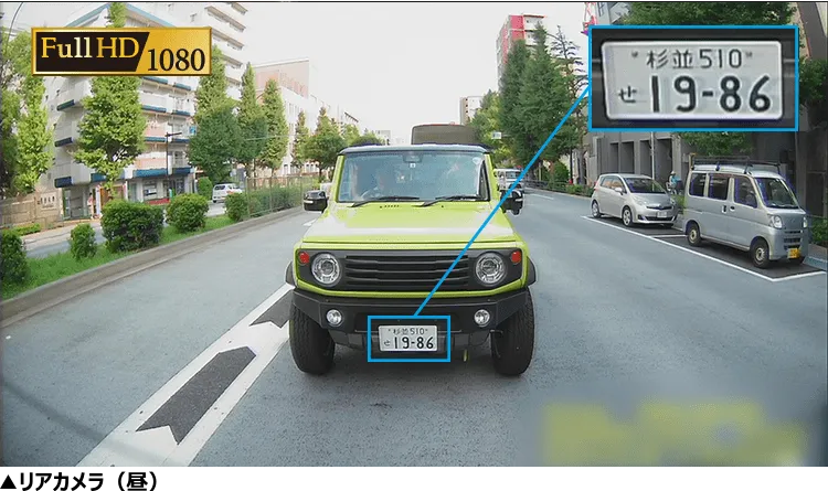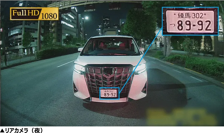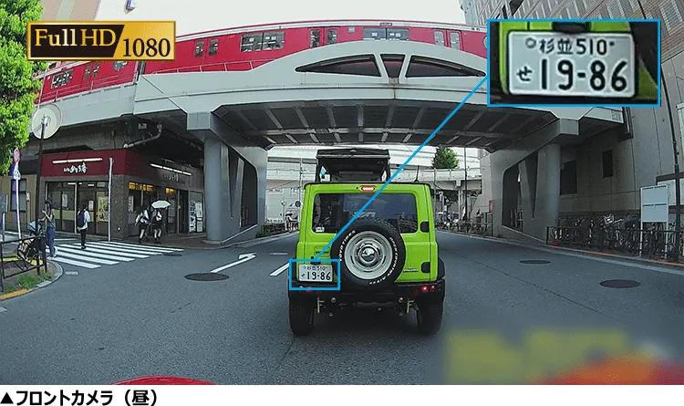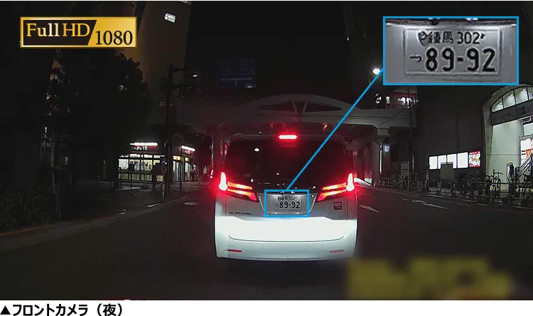 前方・後方ともに、高解像度約200万画素のフルHDカメラを採用することで、周りの状況はもちろん、ナンバープレートの文字までしっかり記録します。