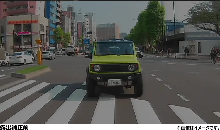 前後カメラのそれぞれの明るさを、見やすさに応じた13段階から選択できる、フロント リアカメラ独立の露出補正機能を装備。リアガラスがスモークガラスの場合は、濃さに応じて調整できるので、後方録画にもしっかりと対応できます。