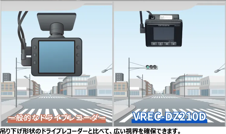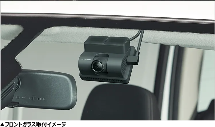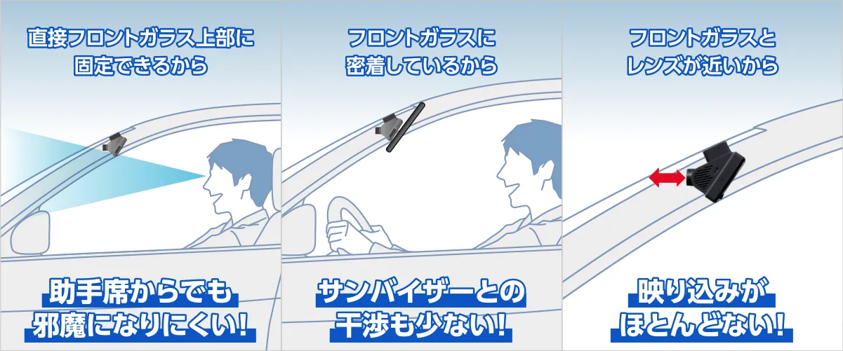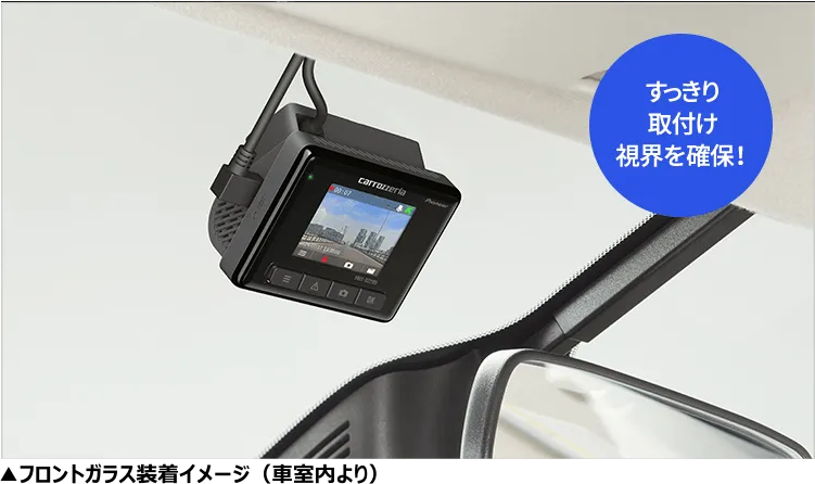 本体を直接フロントガラスにスッキリと取付けられるスマートな形状にすることで、吊り下げ形状に比べて広い視野を確保。フロントガラスとカメラレンズの位置も近いため、映り込みも大幅に軽減されます。また、本体の電源ケーブル端子の挿込口が隠れる構造を採用することで、見た目はもちろん配線の取り回しにまでこだわったスッキリとした取付けが可能です。