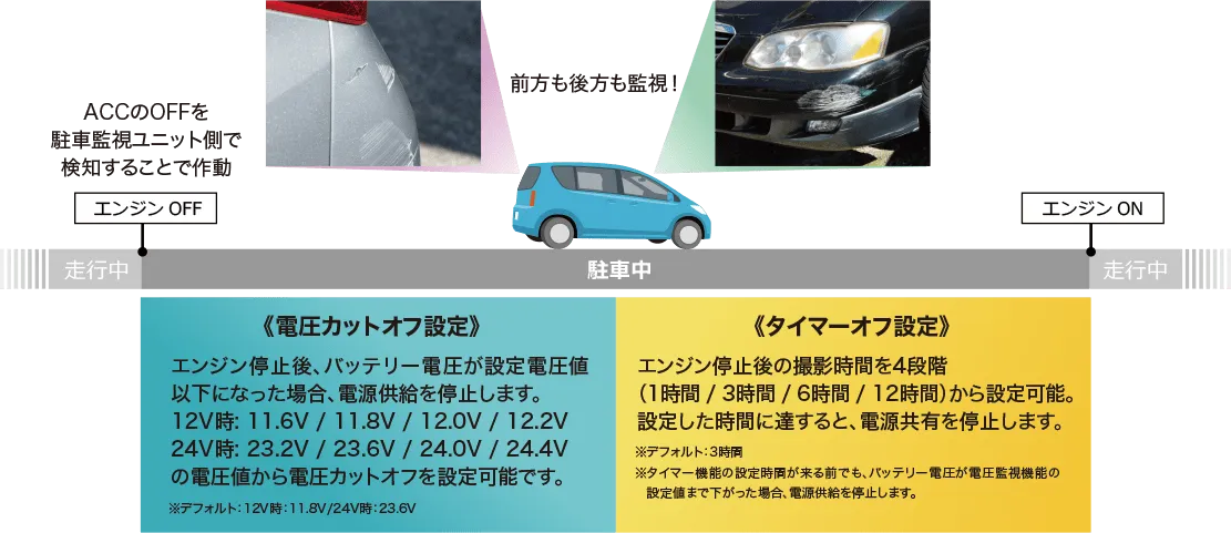 別売の駐車監視ユニット「RD-DR001」を接続することで、エンジン停止後も駐車中の状況を監視、記録することができます。駐車監視ユニット側の電圧カットオフ設定とタイマーオフ設定により、エンジン停止後(ACC オフ)もタイマーオフ設定値の最大12時間まで連続動作が可能です。また、駐車監視中のバッテリー上がりを予防するため、タイマーオフ設定をしている場合でも、電圧低下を監視する電圧カットオフ設定を優先し動作を停止するので安心です。