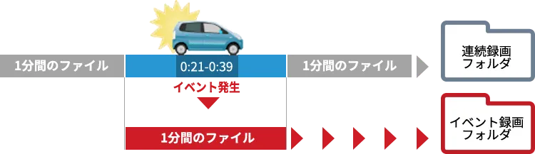連続録画の1分間ファイルの1秒〜20秒の間に衝撃を検知した場合は、ひとつ前のファイルと合わせ、イベント録画として計2分間のファイルを保存します。