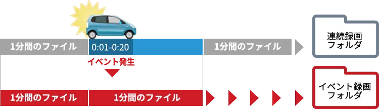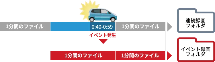 連続録画の1分間ファイルの40秒〜59秒の間に衝撃を検知した場合は、ひとつ後のファイルと合わせ、イベント録画として計2分間のファイルを保存します。