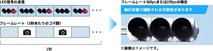 タイミングによっては LED信号が消灯したように記録されてしまう場合があります。 LED信号機は1秒間に60回または 50回の点滅(西60Hz/東50Hz※2倍の回数の点滅もあります)をしています。ドライブレコーダーのフレームレートが30fpsまたは25fpsの場合LED信号機の点滅と同調し、信号の光が撮影できない場合があります。