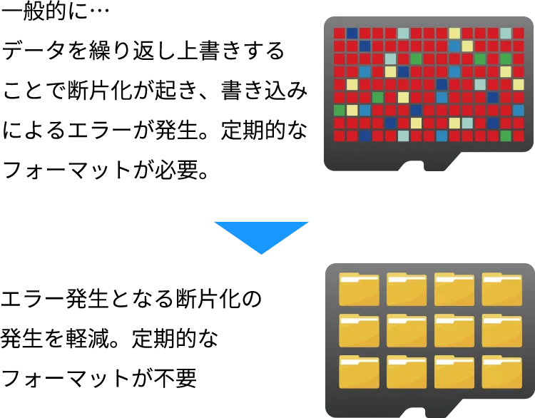 SDカードのエラー発生の原因となる断片化の発生を軽減するため定期的なフォーマットが不要になります。