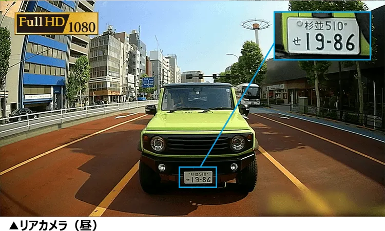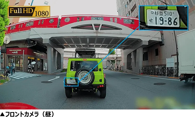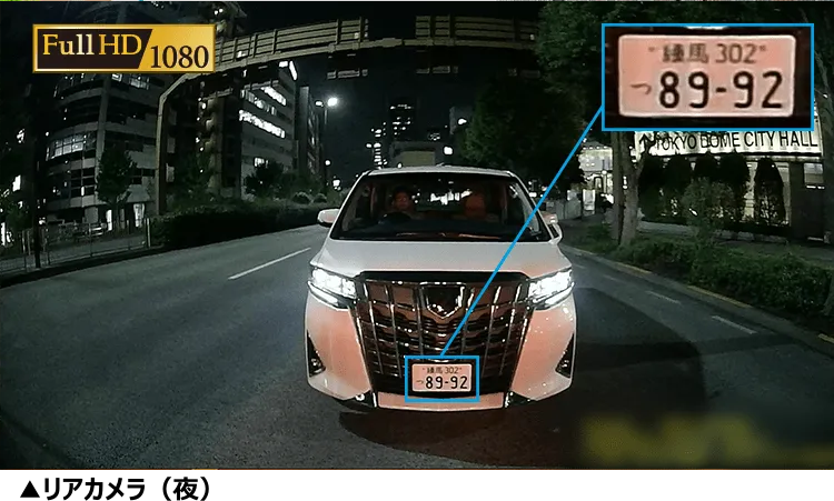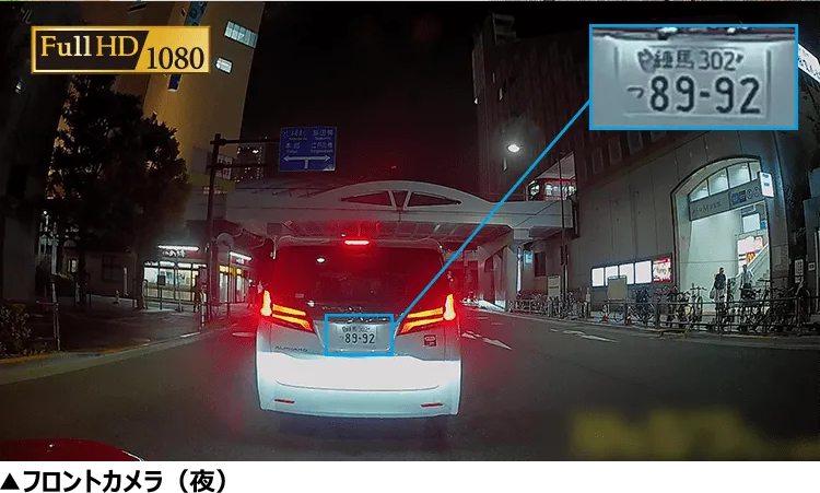 前方・後方ともに、高感度を実現するCMOSセンサーの搭載に加え、高解像度約200万画素のフルHDカメラを採用することで、昼間はもちろん、夜間や暗闇の中でもナンバープレートの文字まで録画できます。